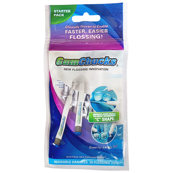 Help make flossing faster and more effective with the GumChucks Starter Pack.The new universal design makes it perfect for both regular flossing and flossing with braces.